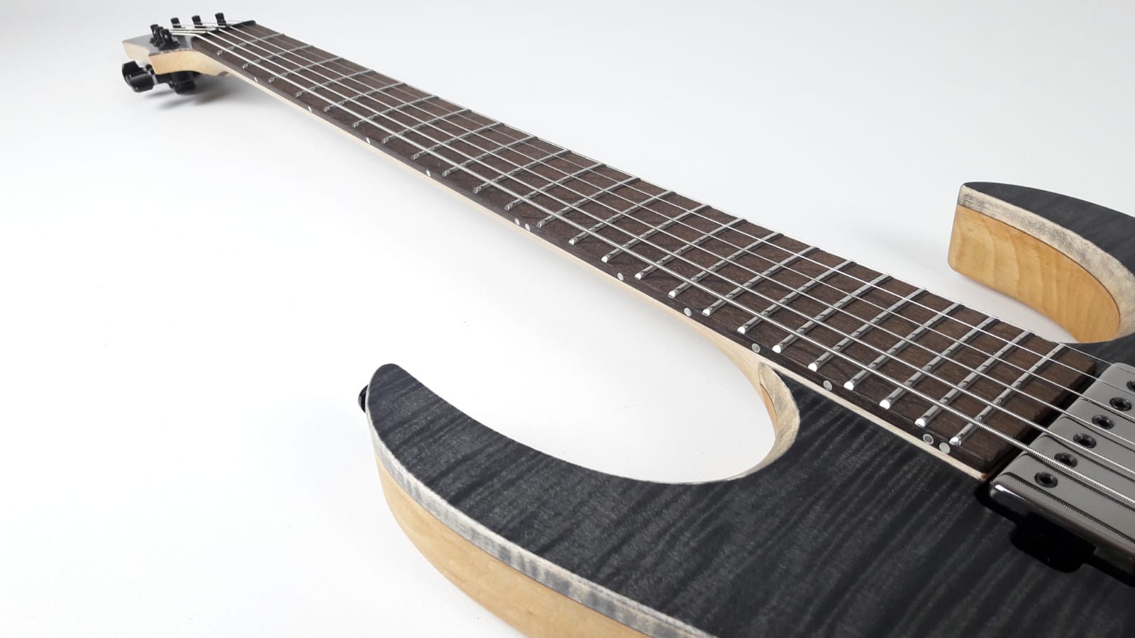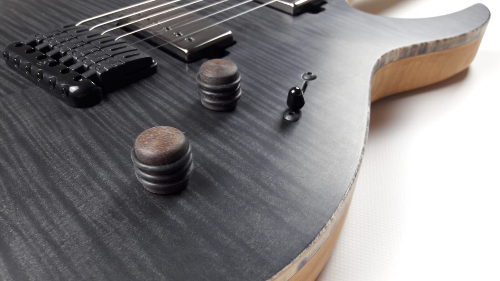 Christoph wanted an unostentatious guitar with no bells and whistles. The result is a custom baritone, with the neck made out of maple. The instrument has bog oak stripes and two carbon rods for stability. The wings of the body are made of alder. Fretboard and volume/tone knob are bog oak as well. The top of the guitar is book-matched maple. Matthias doesn’t build with exotic or endangered wood; he believes in sustainable guitar building – sometimes using wood from local fruit trees.